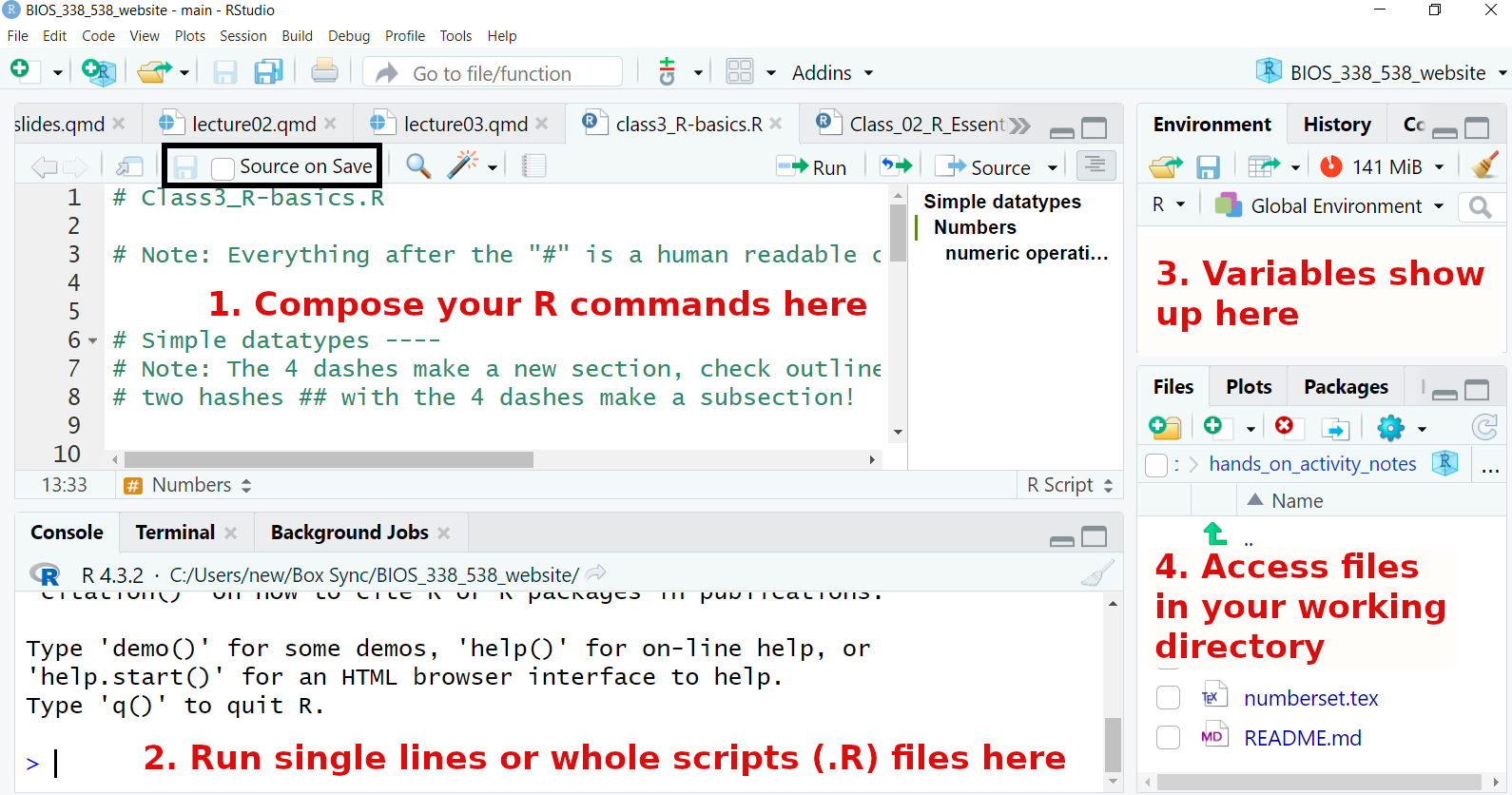 Note: Download the class3_R-basics.R file again from the website (I updated it.. You can rename last weeks file with the _old suffix … _old.R)