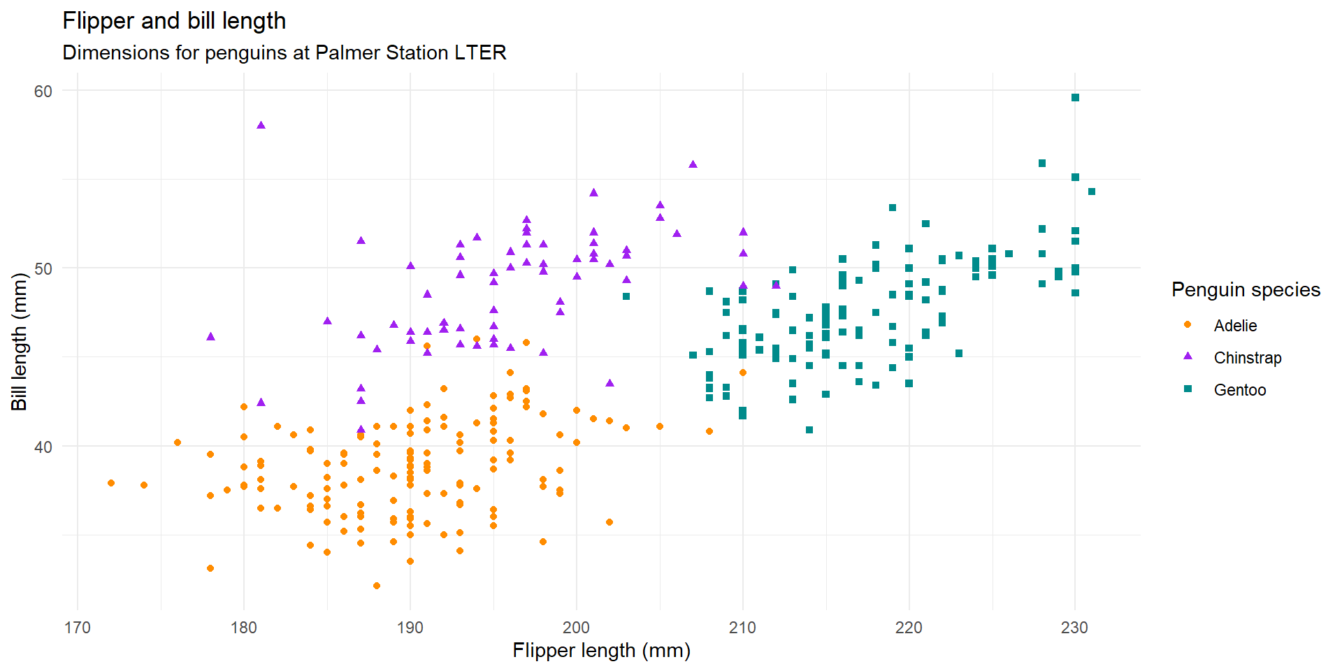 x = "Flipper length (mm)", y = "Bill length (mm)",